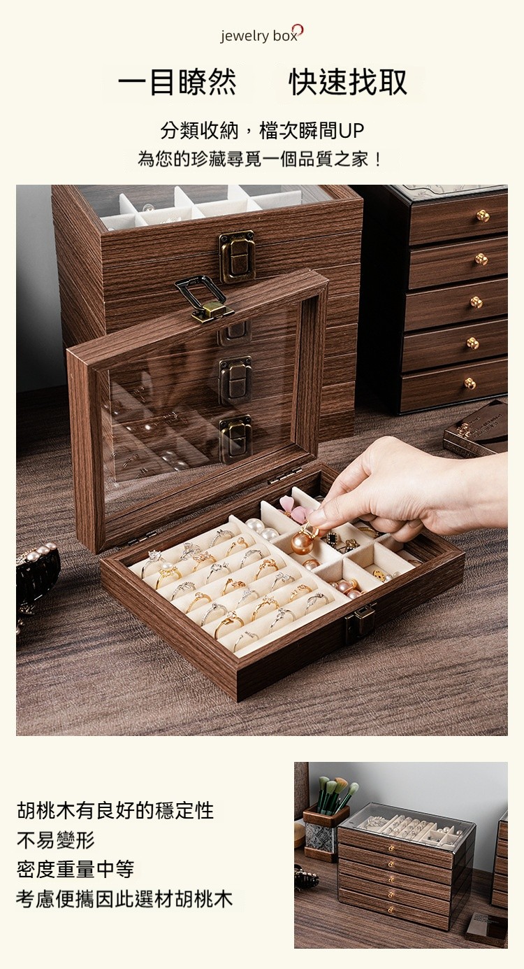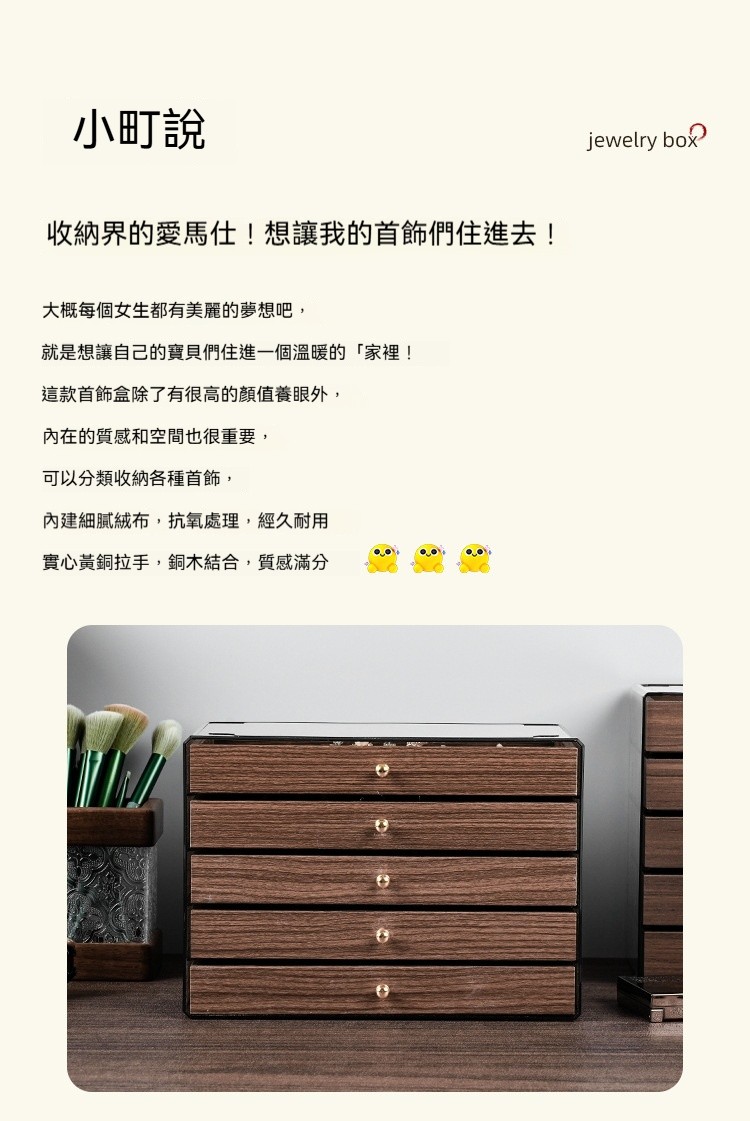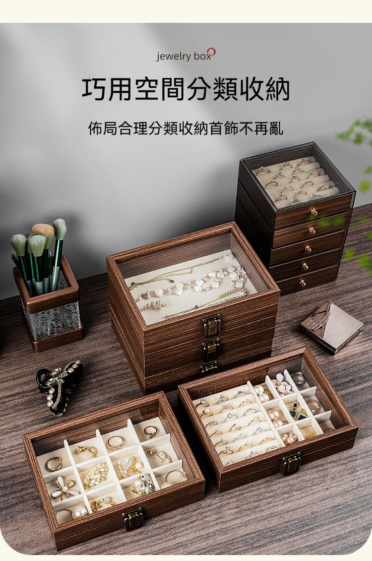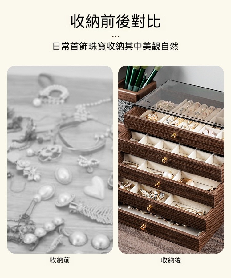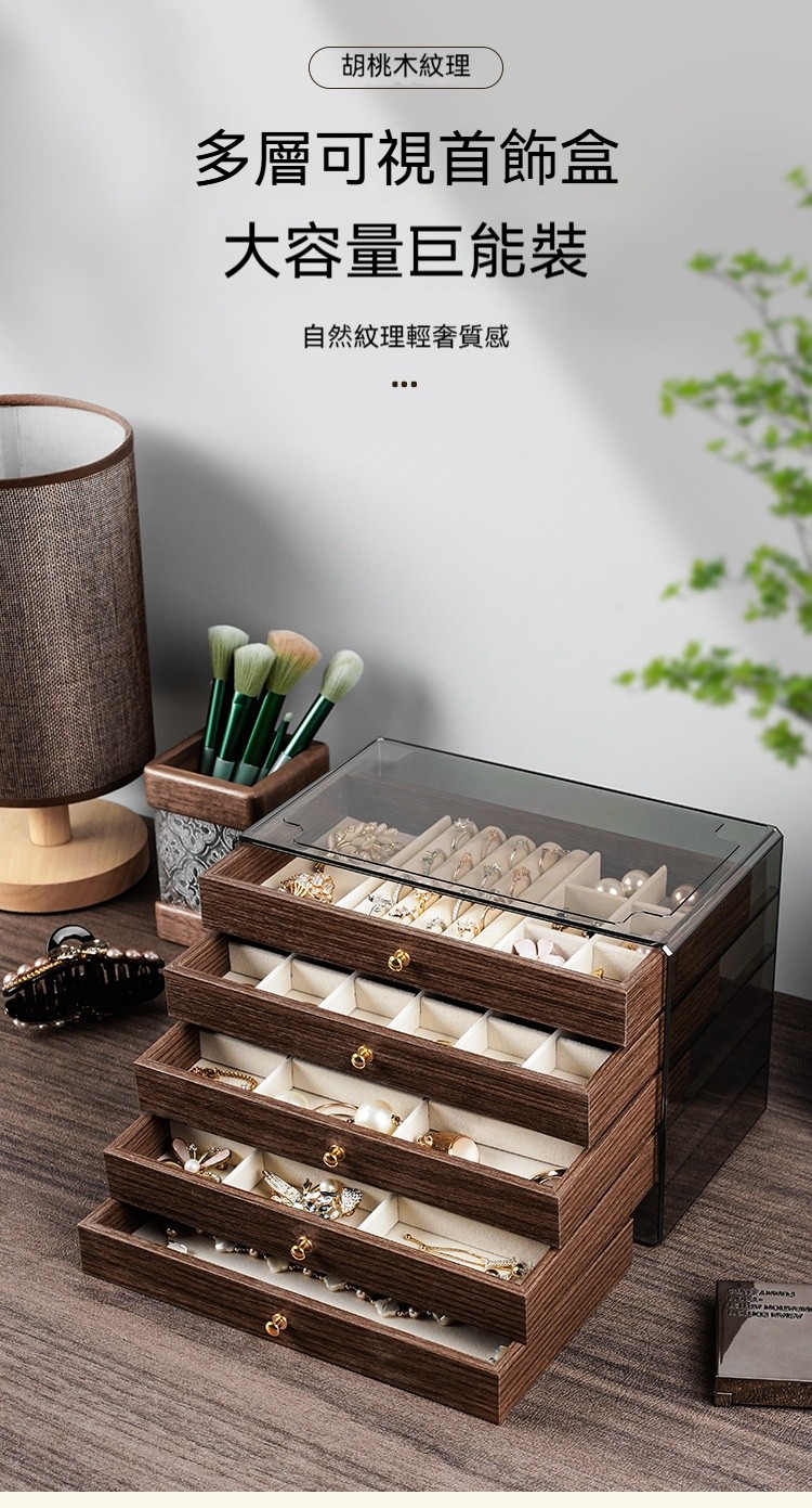 這款 胡桃木紋飾品收納盒,幫妳輕鬆收納所有心愛飾品,整齊又優雅!✅ 五層大容量|分區收納超整齊 項鍊、耳環、耳釘、戒指、手鍊… 每層都有自己的家,拿取超方便! ✅ 高檔胡桃木紋|質感滿分 復古木紋設計,低調奢華,放在梳妝台上就像一件藝術品 ✅